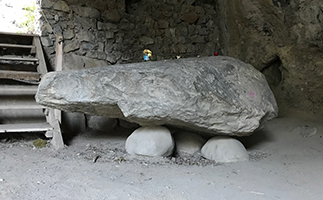 Das Herzstück auf der männlichen Seite der Mysterienschule und auf der rechten, sonnenzugewandten Talseite ist die Höhle, welche von den Katharern „Bethlehem“ genannt wurde. Hier empfingen die Bonhommes und Bonnedames das Licht in ihren Herzen als Abschluss ihres Weges durch die Mysterienschulen dieses Tales. In dieser Höhle befindet sich ein riesiger Dolmen, der dort seit Urzeiten jeweils nur am 21. Dezember voll im Sonnenlicht steht. Er betont eine nord-südliche Fliessrichtung und ist seit megalithischen Zeiten ein Kernstück der ganzen Anlage. 001 und ich machten am Tag vor Samhain eine Zeremonie mit dem Gralstein, der dies ja ausdrücklich von uns verlangt hatte. Als wir die Zeremonie abschlossen, beschien die Sonne den südlichen Stützstein des Dolmen. Auch hier luden wir alle geistigen Wesen ein, die ihr Wissen hier deponieren möchten, um Menschen weiterhin zu inspirieren auf ihrem Weg zur Bewusstwerdung. Der Dolmen wie auch der Gralstein wurden eingewoben ins Netzwerk der Traumzeit, und ich sah ein Blitzlicht-Gitternetz in sechseckigen Rastern, welches sich an diesem Dolmen verdichtete. Gleich einer Wiederbelebung begann das ätherisch-photonische Innenleben dieser Höhle zu pulsieren. Allerlei Begleitung aus der Traumzeit – Schamanen aus aller Welt – feierten mit uns diese Rückverbindung. Eine sehr starke Verbindung mit Tasmaniens Ei der schwarzen Schlange (Erdzirbeldrüse) und der neuen Hüterschaft desselben am Titicaca-See (wo ich ähnlichen magnetischen Steinen in den Händen eines hundertjährigen Schamanen begegnete) meldeten sich. Das Netzwerk der Gralssteine und Kristallschädel bildet den photonischen Teppich der Traumzeit und hilft uns die träumende telepathische Kommunikation aufrecht zu erhalten oder wieder zu erlernen. Trotz exoterischer Hilfsmittel sind wir immer wieder dazu aufgefordert dies alles in uns drin zu finden und zu aktivieren. Dieses Denken war einer der Grundsätze der Katharer, welche lebende Beispiele für die Umsetzung ihres Wissens waren. Kern ihrer Philosophie war der Glaube, dass jede/r Gott selbst in sich trägt und deshalb keines Vermittlers in Form von Papst oder Priester braucht. Somit wurden sie in den Augen der Kirche zur Bedrohung und Ziel ihrer Inquisition. In der damaligen Zeit war die Betlehem-Höhle die Einweihungsstätte für den letzten Schritt des inneren Weges, und von hier trugen die Bonhommes und Bonnedames ihr gnostisches Wissen und ihre Strahlkraft in die Welt hinaus. Eine Wanderung von Betlehem nach Montségur war hierfür die Initiation.